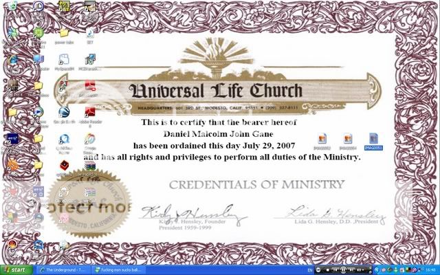 My certificate of Ordenation from the united church of life where myself and my bass player Ordained ourselves on line sunday lol. God I love doing random ****.